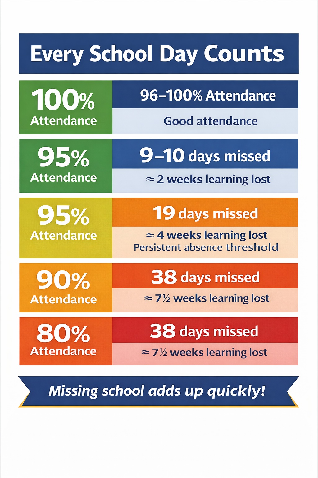 Learning is a progressive activity; each day’s lessons build upon those of the previous day(s). One week of absence could miss entire learning units.