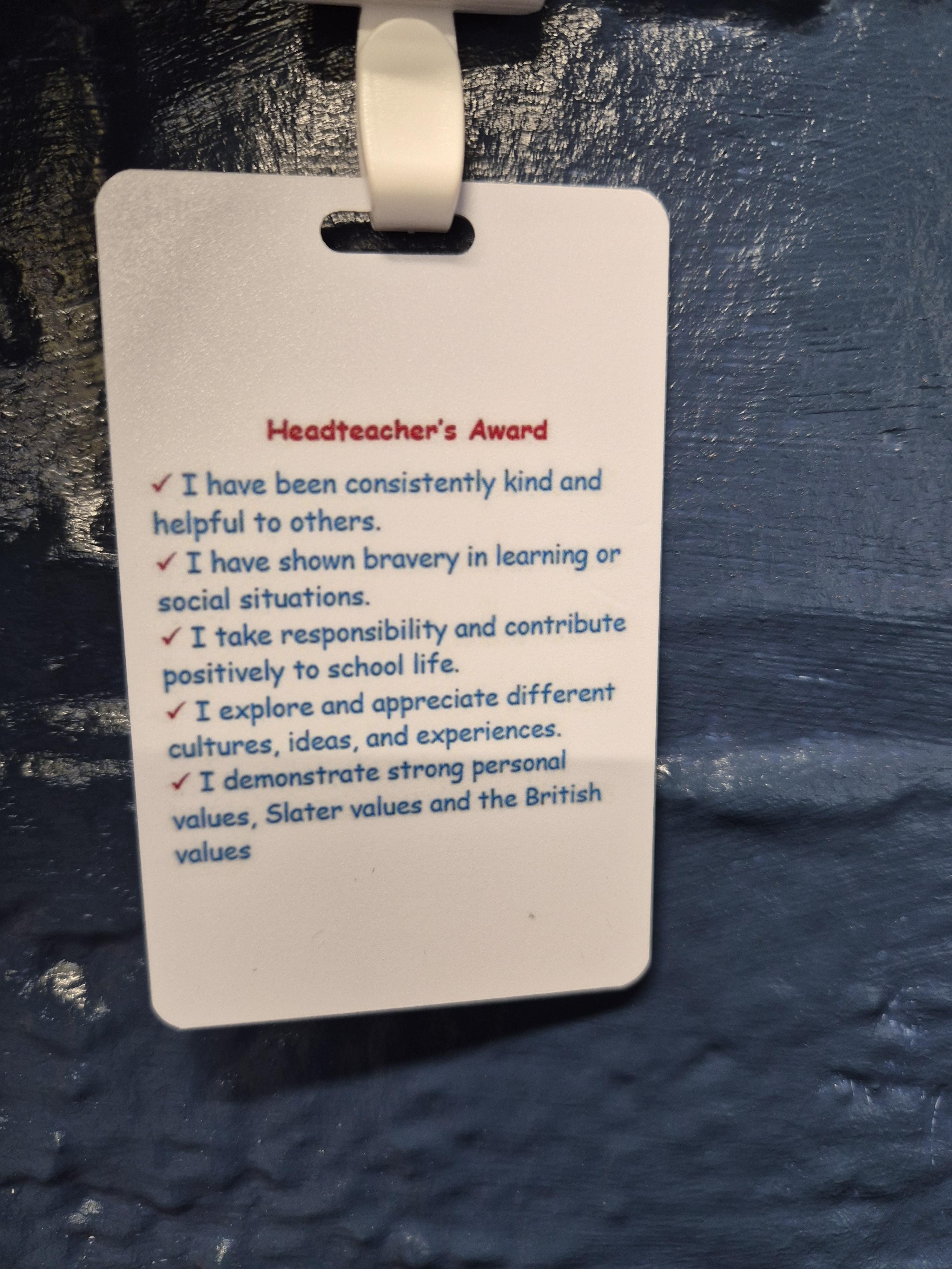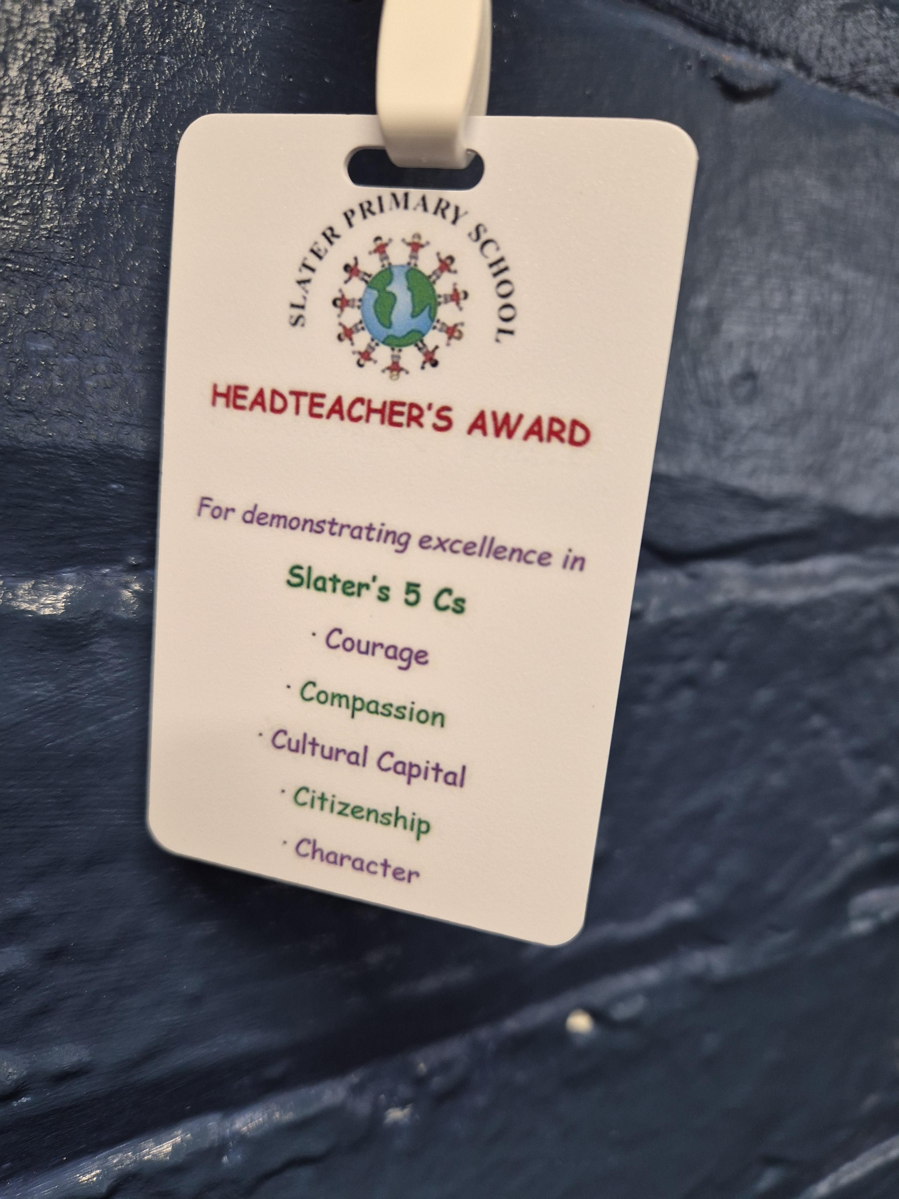 Headteacher's Special Award for demonstrating excellence in Slater's 5 Cs.